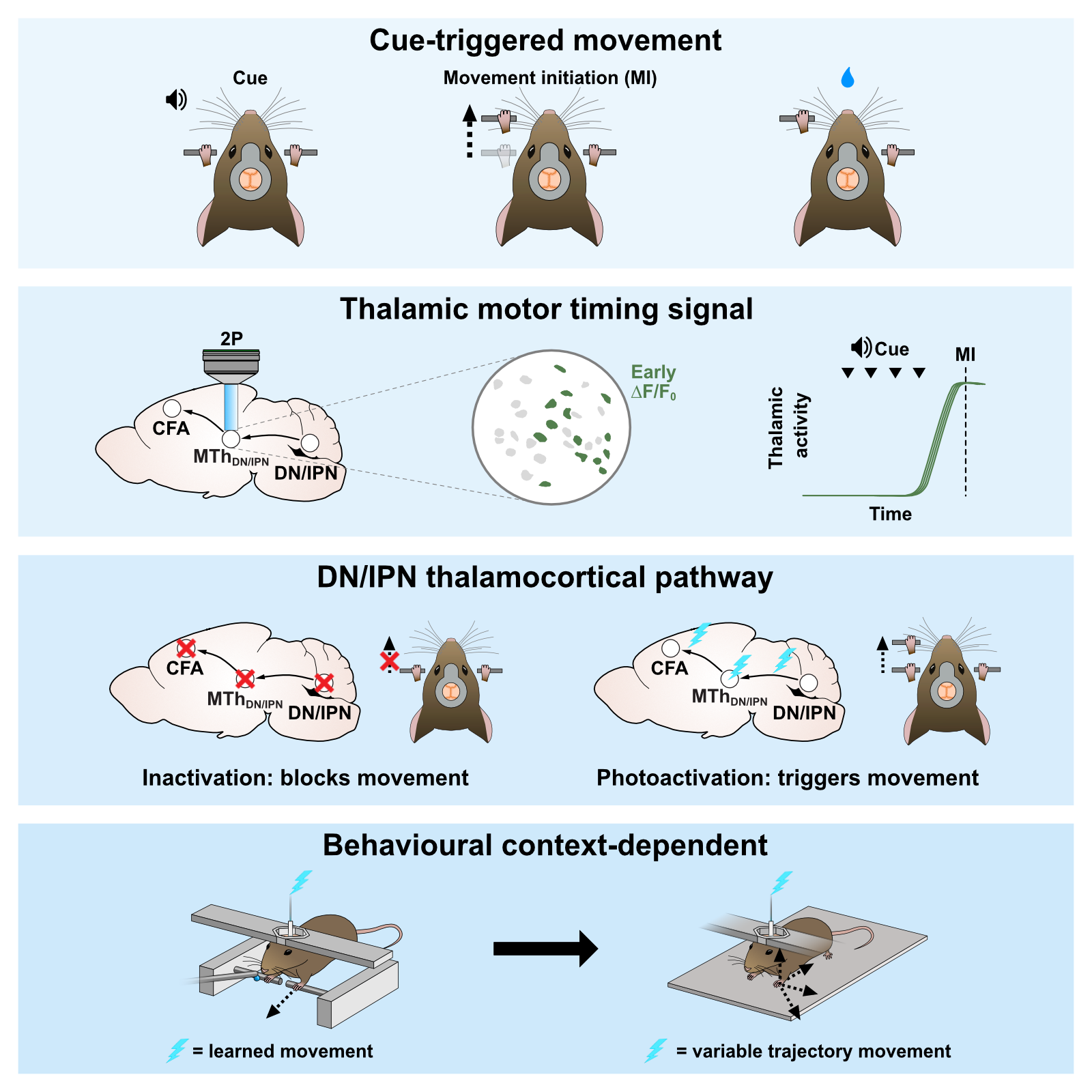 Several theories suggest that the cerebellum is involved in movement initiation. In this study we provide evidence to suggest that activity along the dentate/interpositus cerebellar thalamocortical pathway triggers voluntary forelimb movement in a behavioral context-dependent manner.