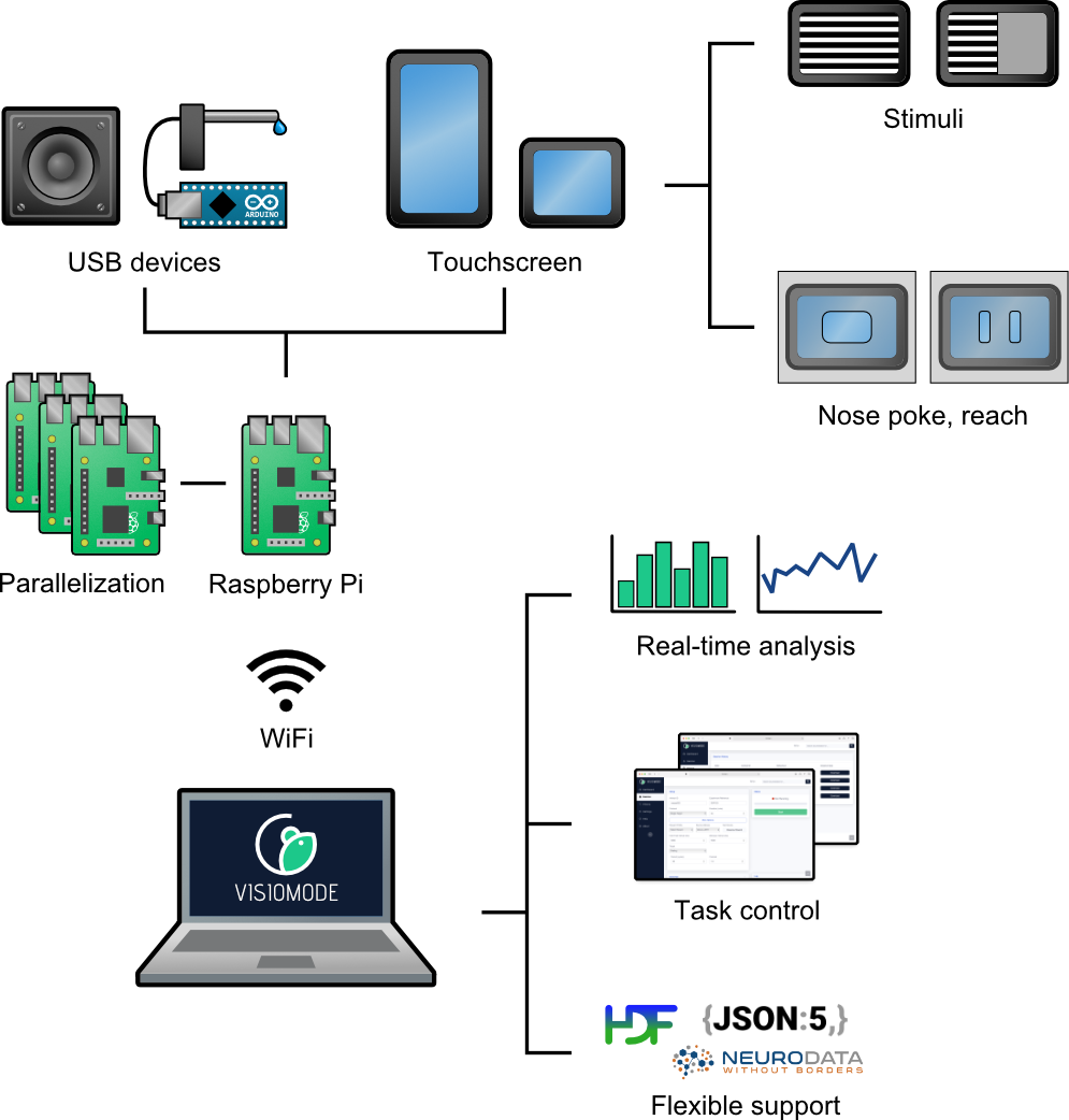 This paper describes the open-source platform Visiomode designed to facilitate development of rodent visually-directed behavioral tasks. Visiomode can be used to build both simple stimulus-response and more complex reaching-based visual discrimination tasks.