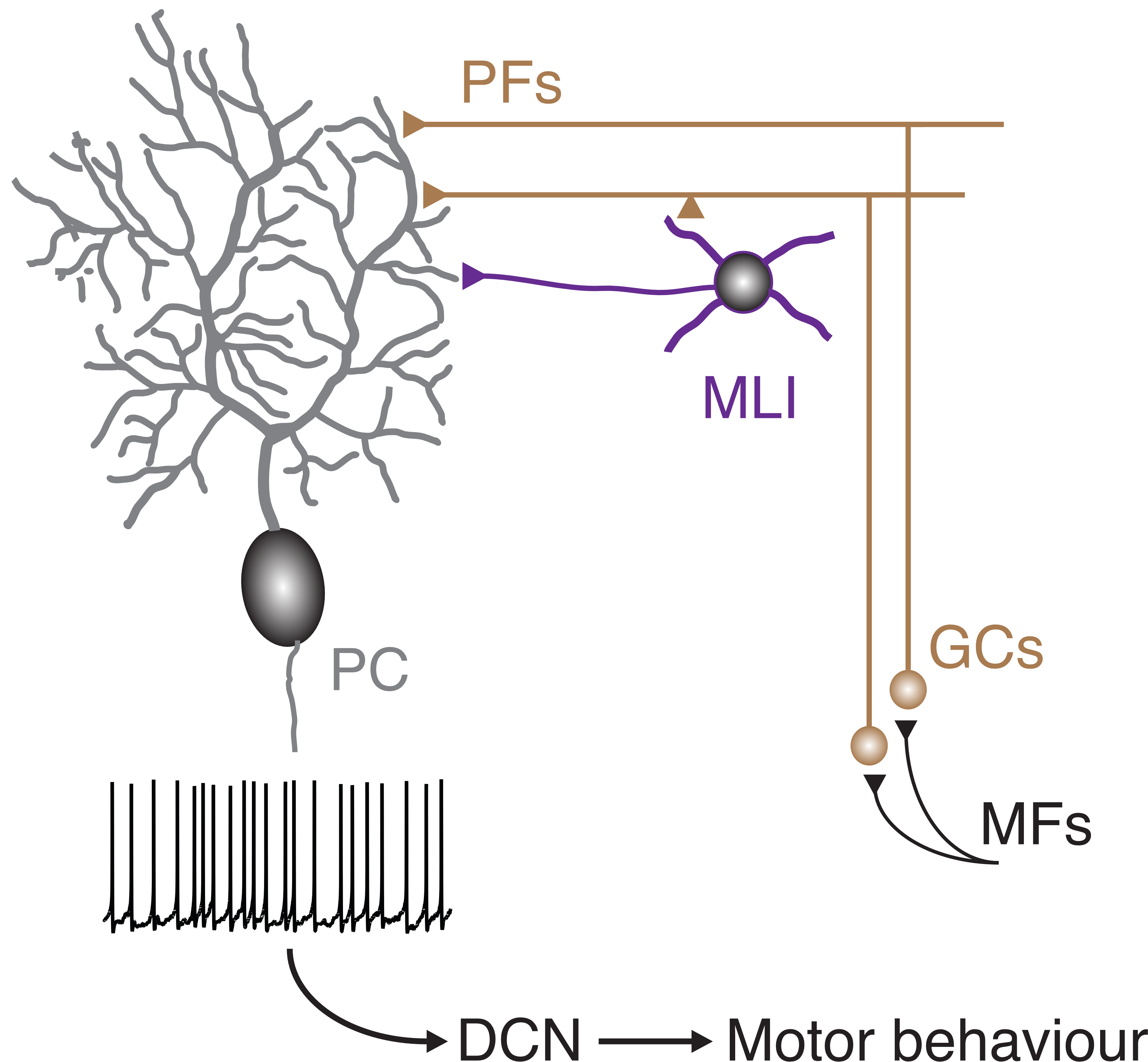Feedforward excitatory and inhibitory circuits regulate cerebellar output. By combining dendritic/somatic patch-clamp recordings & optogenetics we show that finely balanced Purkinje cell dendritic excitation/inhibition shapes cerebellar output during self-paced locomotion.
